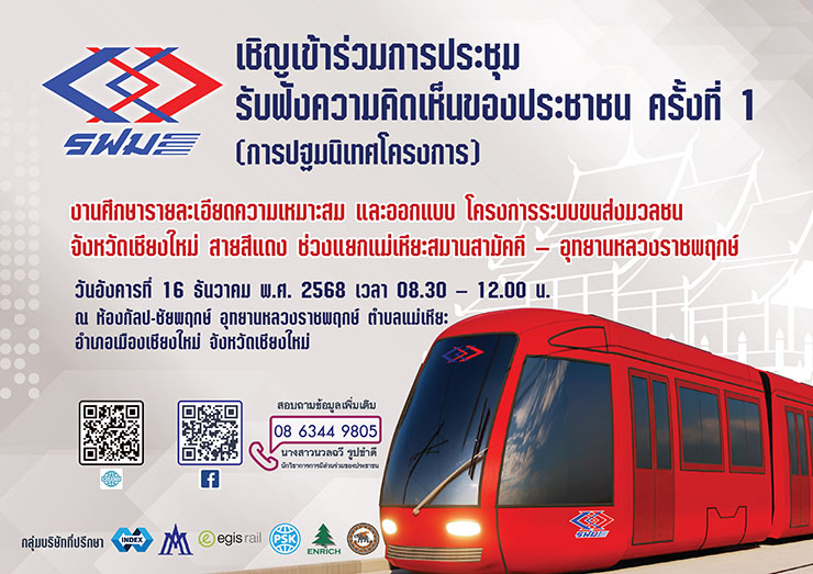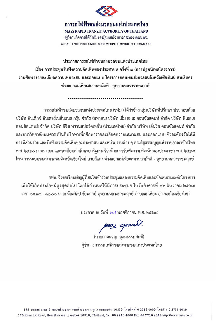 | ประกาศเชิญประชุมรับฟังความคิดเห็นของประชาชน ครั้งที่ 1 (ปฐมนิเทศโครงการ) ช่วงแยกแม่เหียะสมานสามัคคี - อุทยานหลวงราชพฤกษ์ |